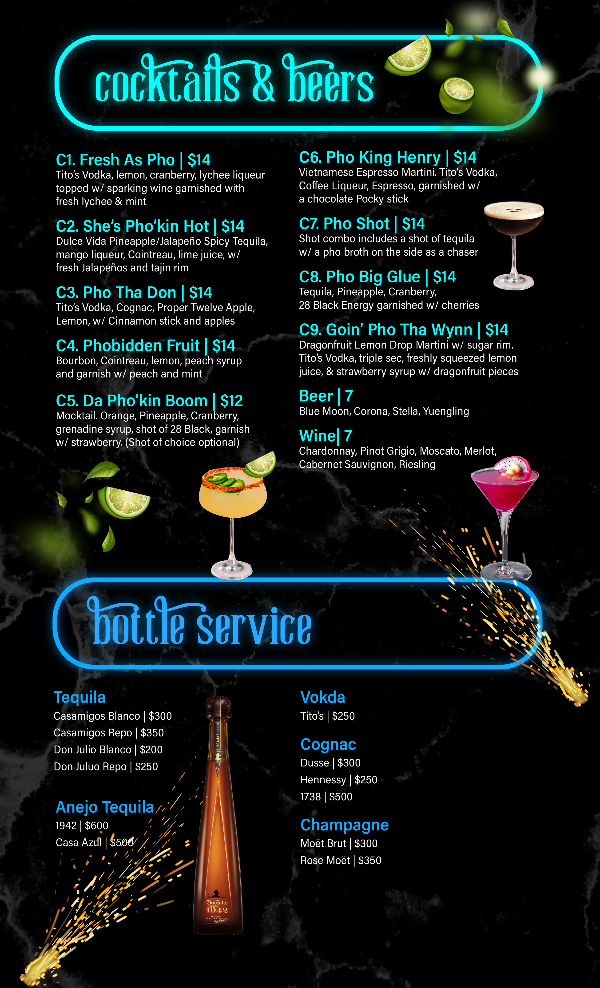 Menu Pholicious Menu Reserve Reserve A Table Your exquisite dining experience is just a reservation away. Book now Click to order now 1126 Euclid Ave NE Atlanta, GA 30307 (404) 549-2984 Mon-Thu: 2pm - 2am Fri-Sat: 2pm - 5am Sun: 12pm-12pm